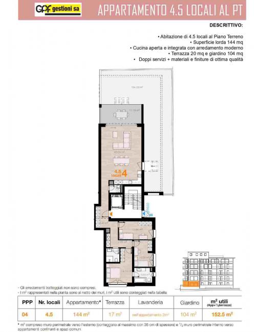 Ampio appartamento di ca. 140m2 con terrazza di 20m2 giardino privato di 105m2 Palazzina di recente costruzione in Via Rovedo 13. Situato in zona tranquilla a pochi passi dal centro di Locarno. Assegnati un posto a